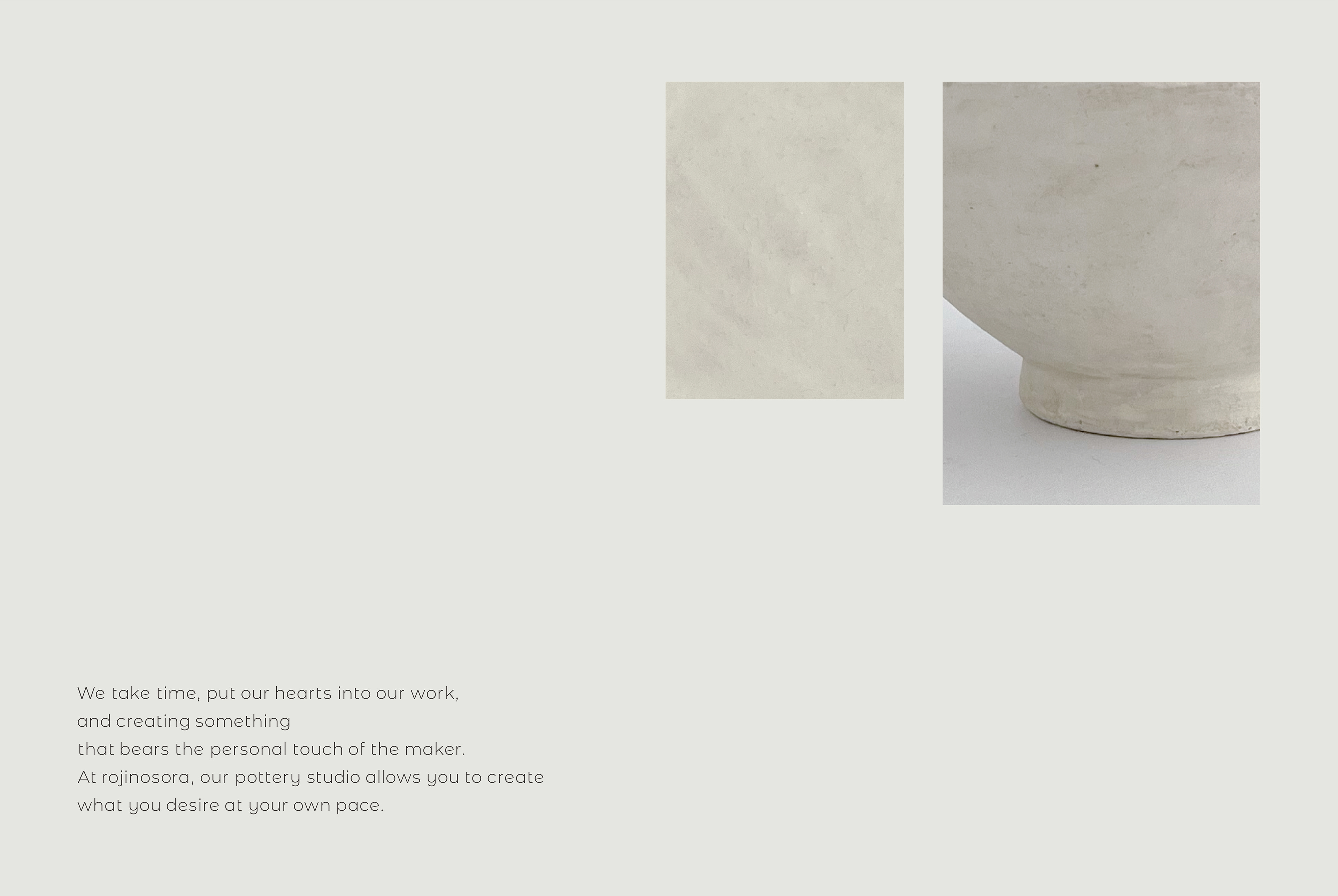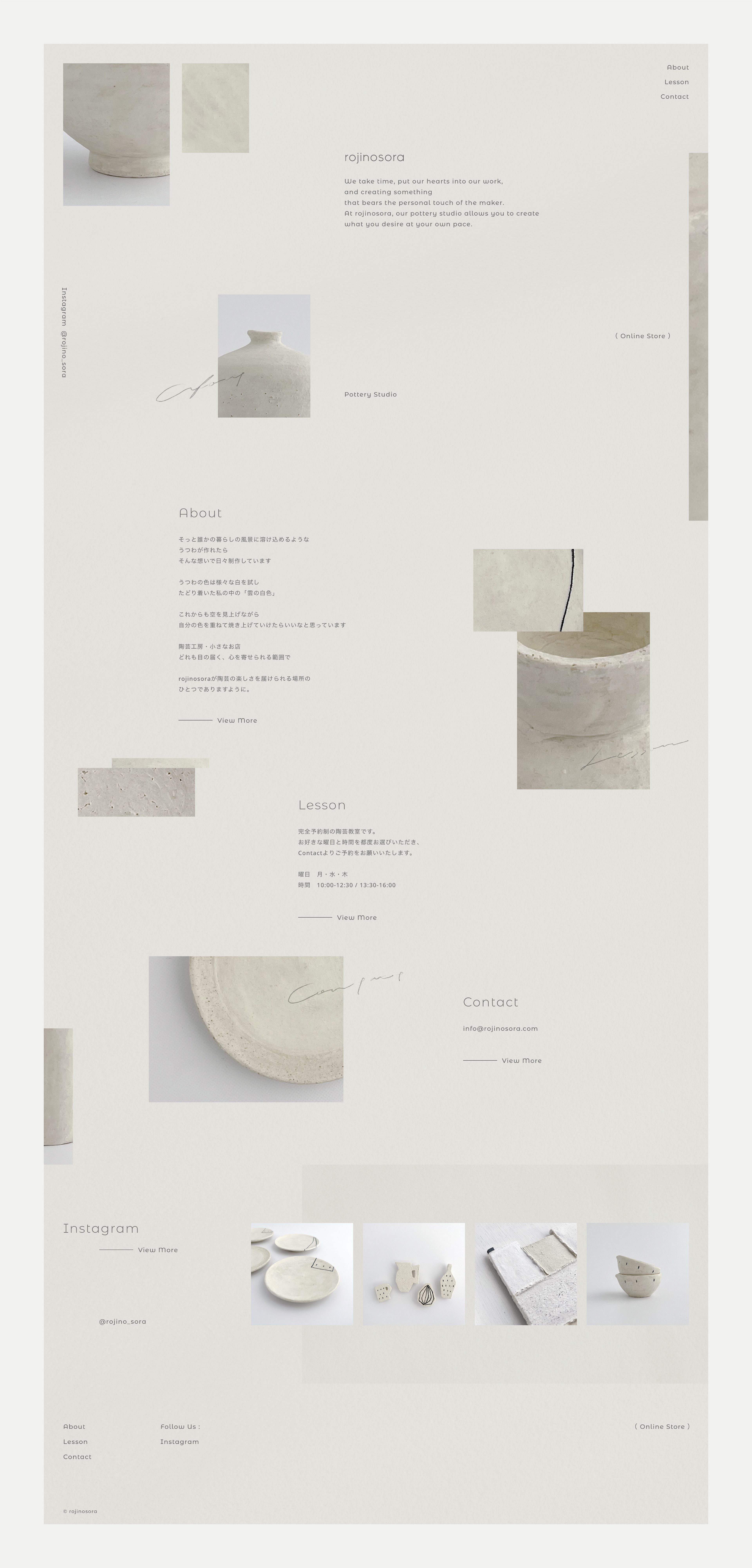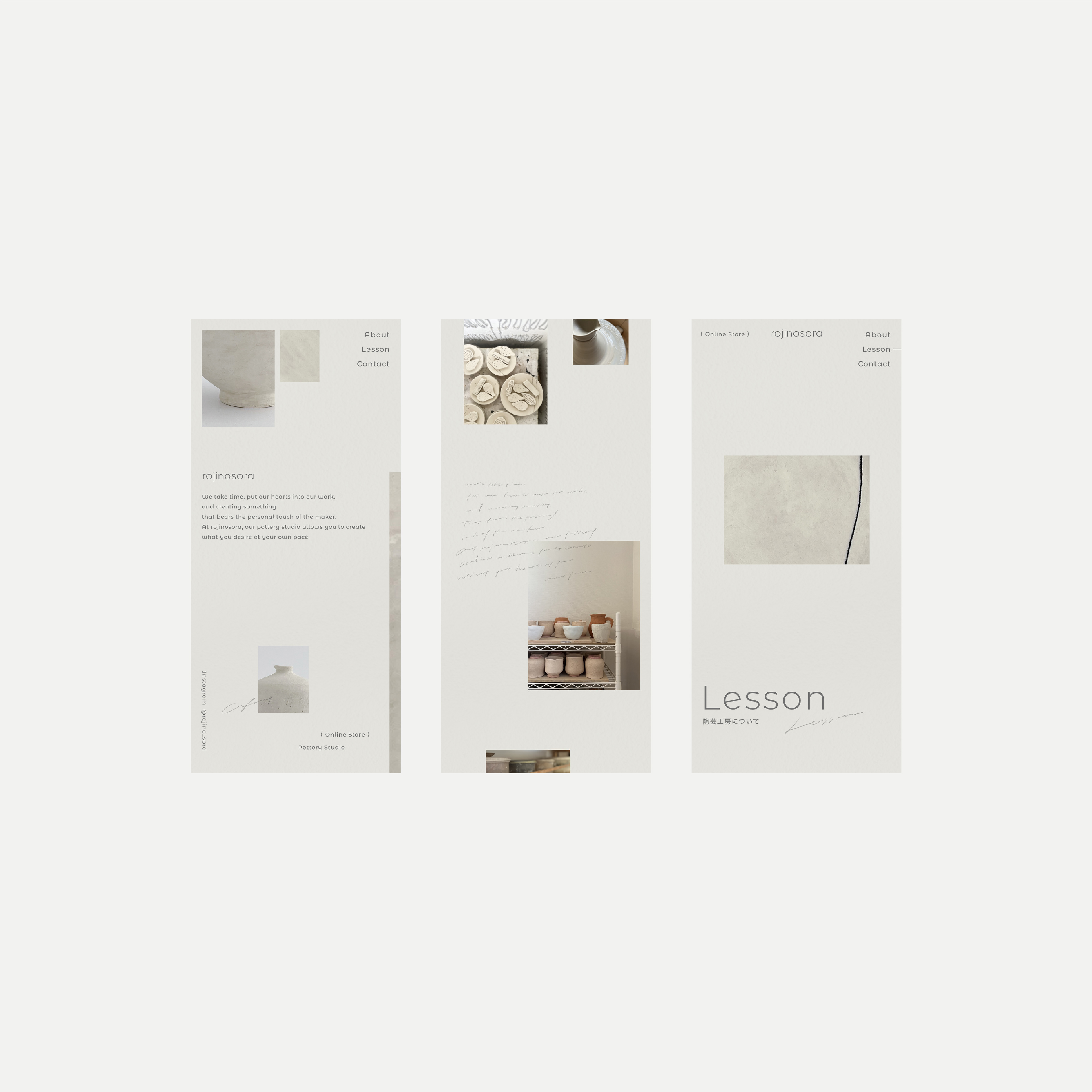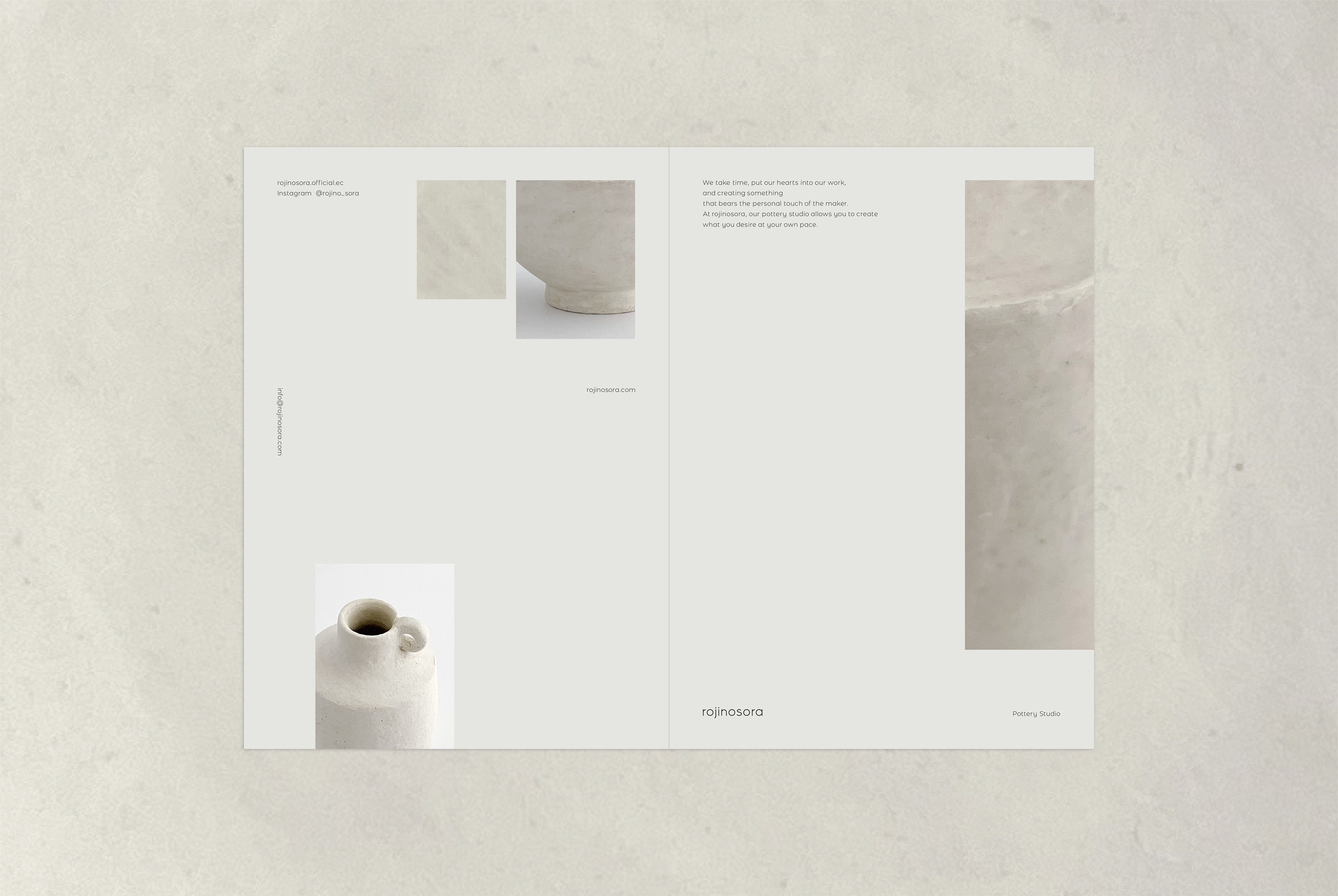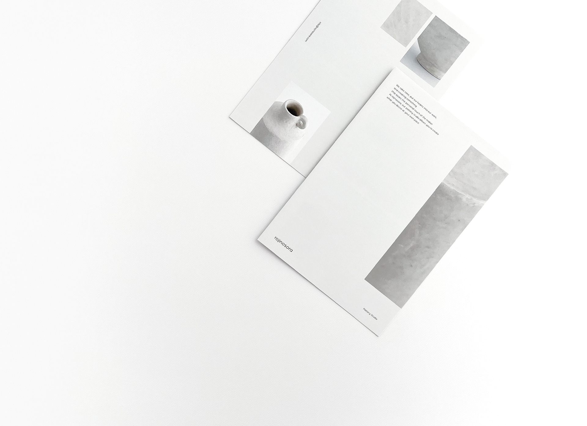 陶芸工房・小さなお店「rojinosora(ロジノソラ)」のブランディング。ロゴ、名刺、ショップカード、パンフレット、看板、ビジュアルディレクション、撮影、Webサイトなどのデザインを担当いたしました。